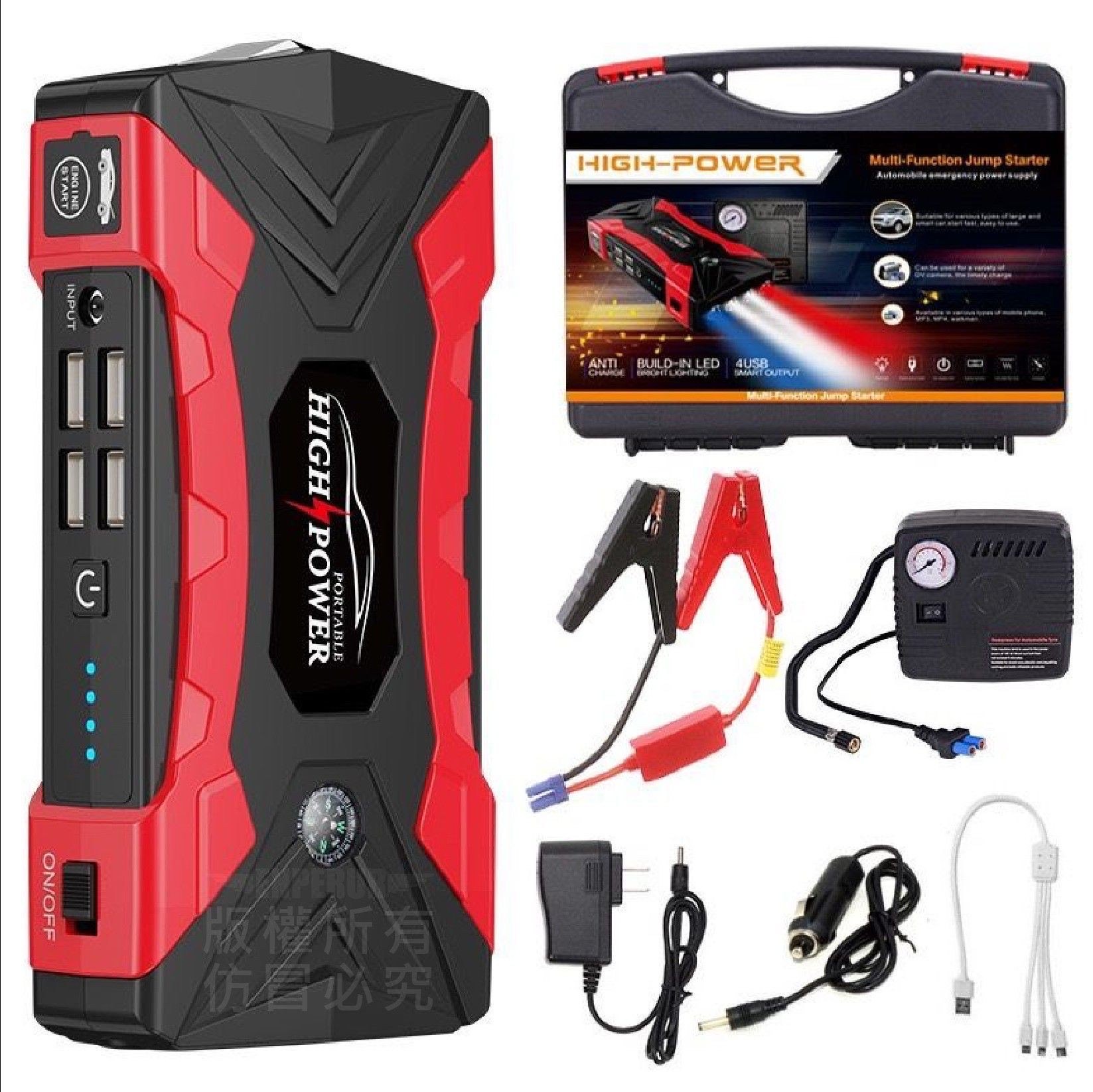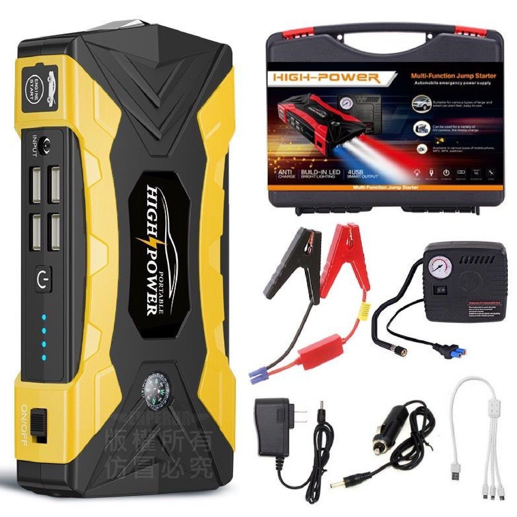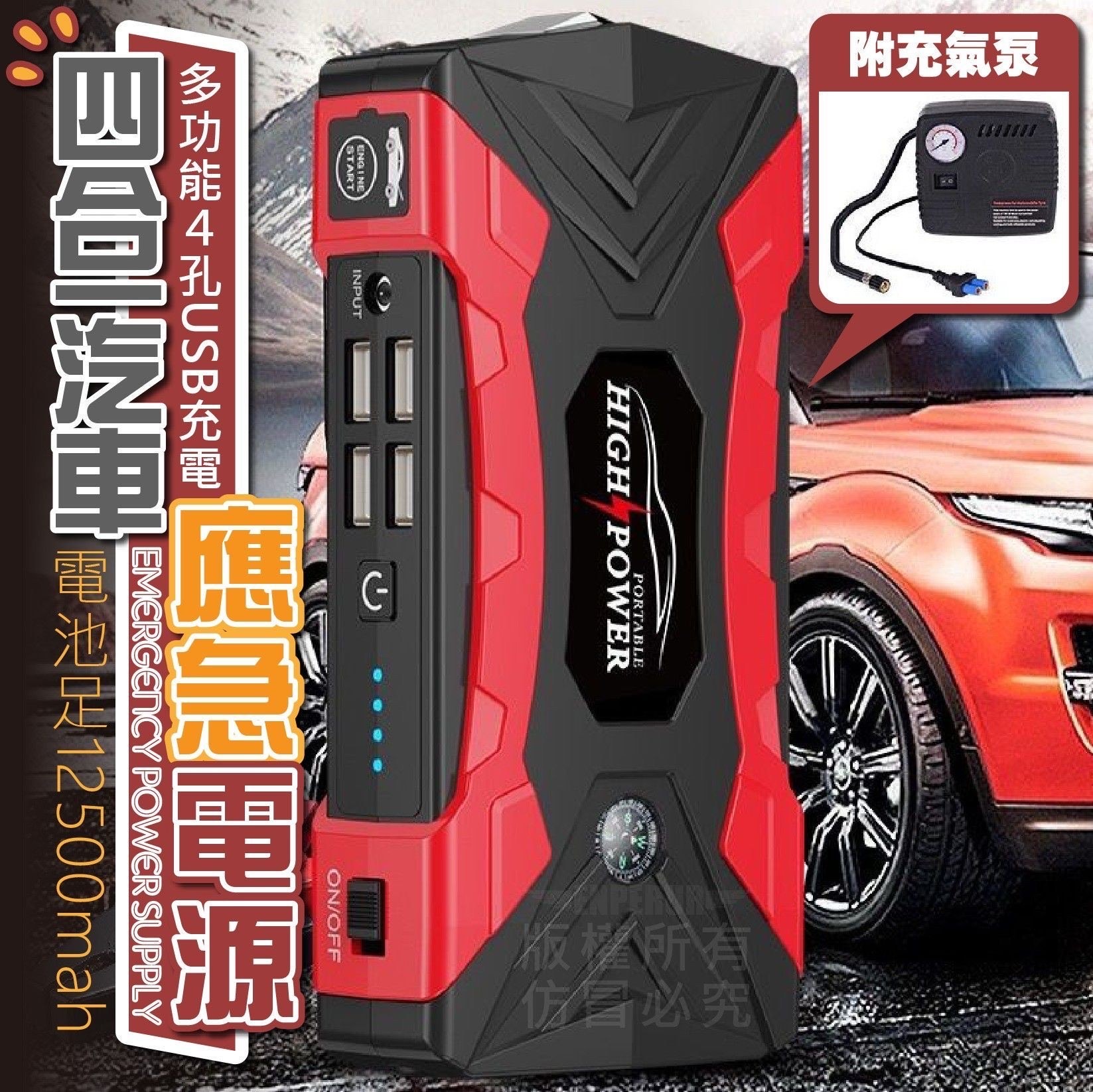 四合一汽車應急電源是一種結合了汽車救車啟動、輪胎打氣、LED照明及行動電源充電等多種功能的應急設備。 它能應急啟動汽車電瓶、快速為輪胎充氣,並具備照明、爆閃、SOS求救功能,還能為手機等裝置充電,是車輛應急準備的重要配件。