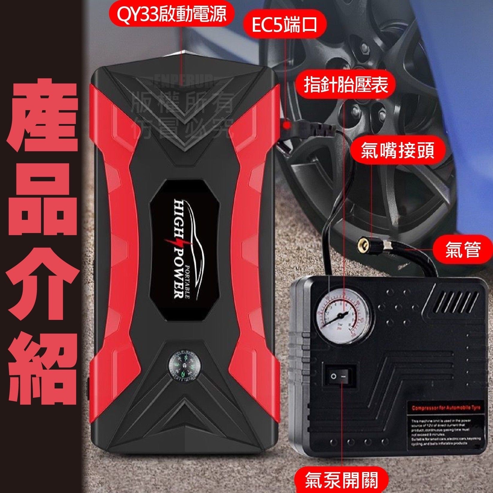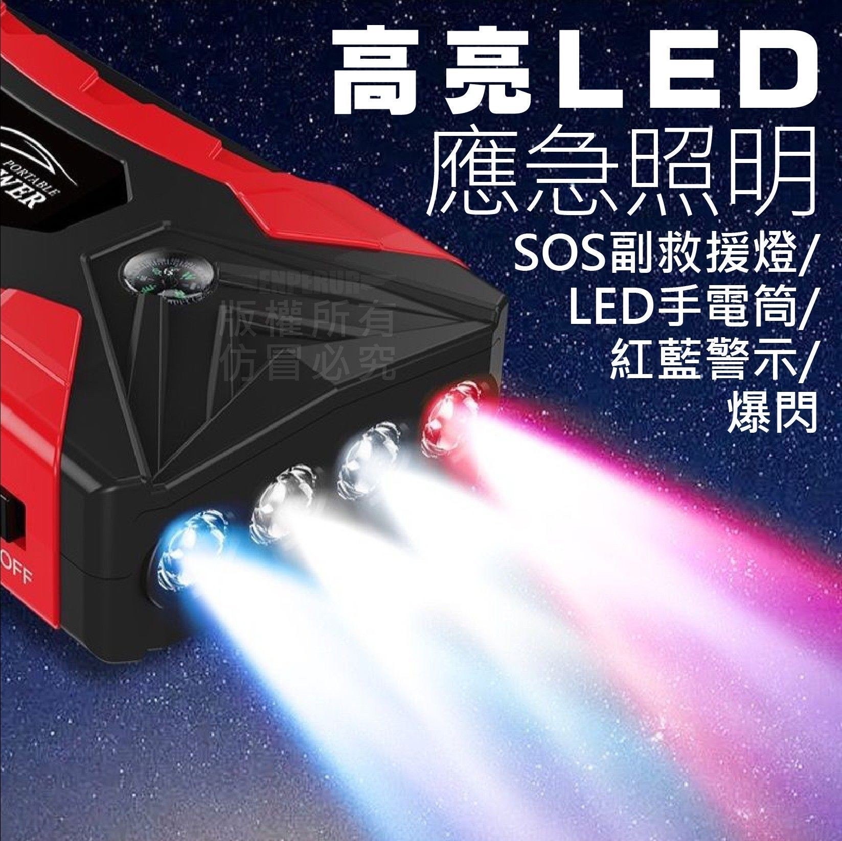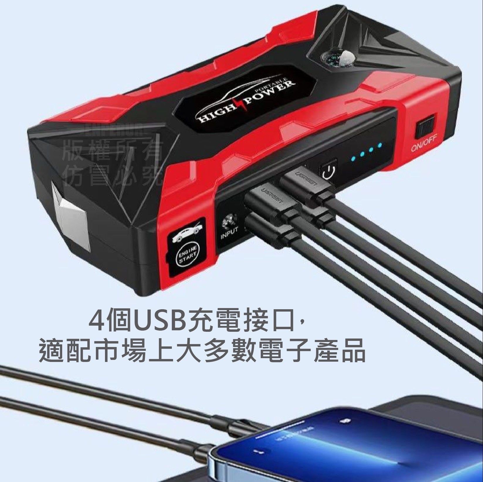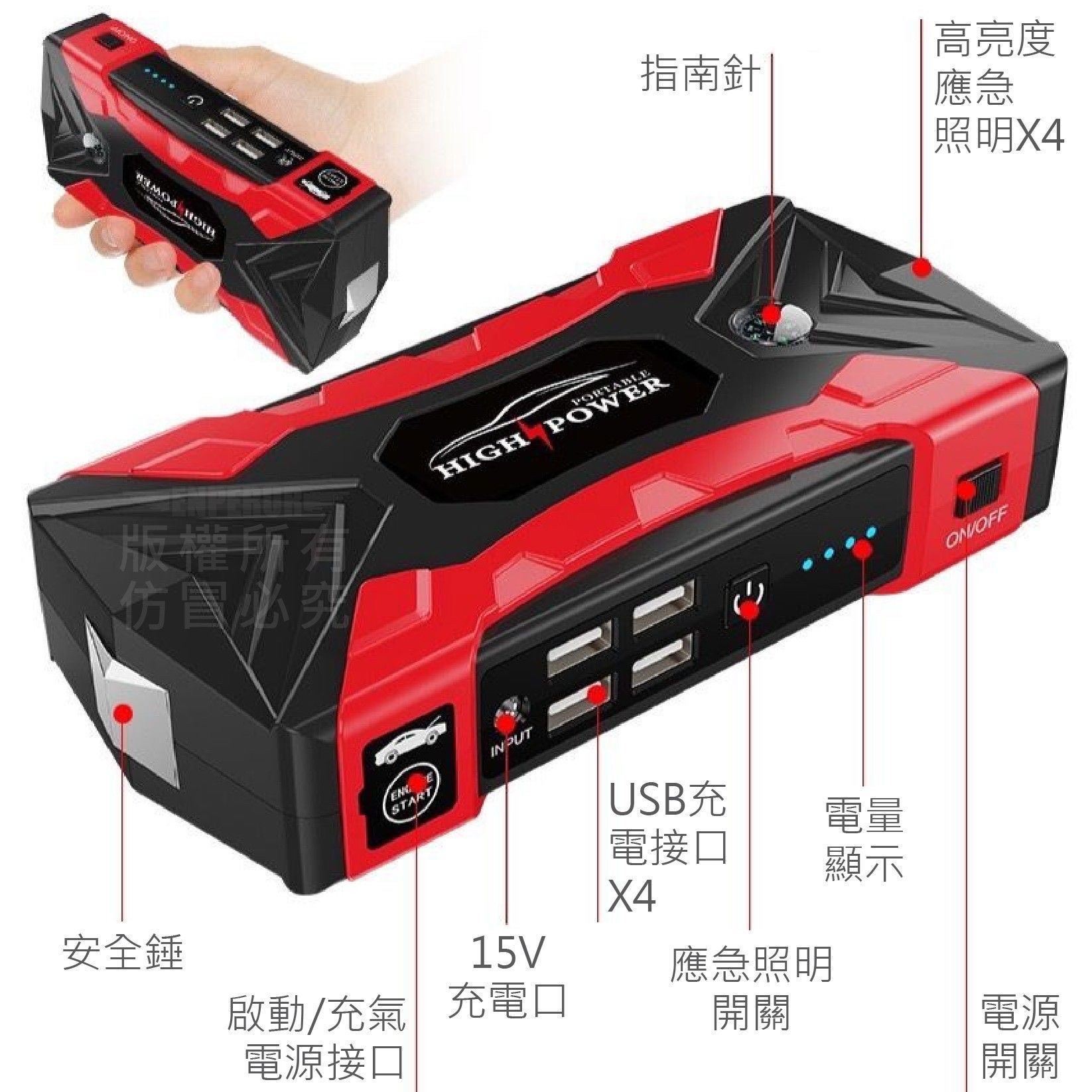 四合一汽車應急電源是一種結合了汽車救車啟動、輪胎打氣、LED照明及行動電源充電等多種功能的應急設備。 它能應急啟動汽車電瓶、快速為輪胎充氣,並具備照明、爆閃、SOS求救功能,還能為手機等裝置充電,是車輛應急準備的重要配件。