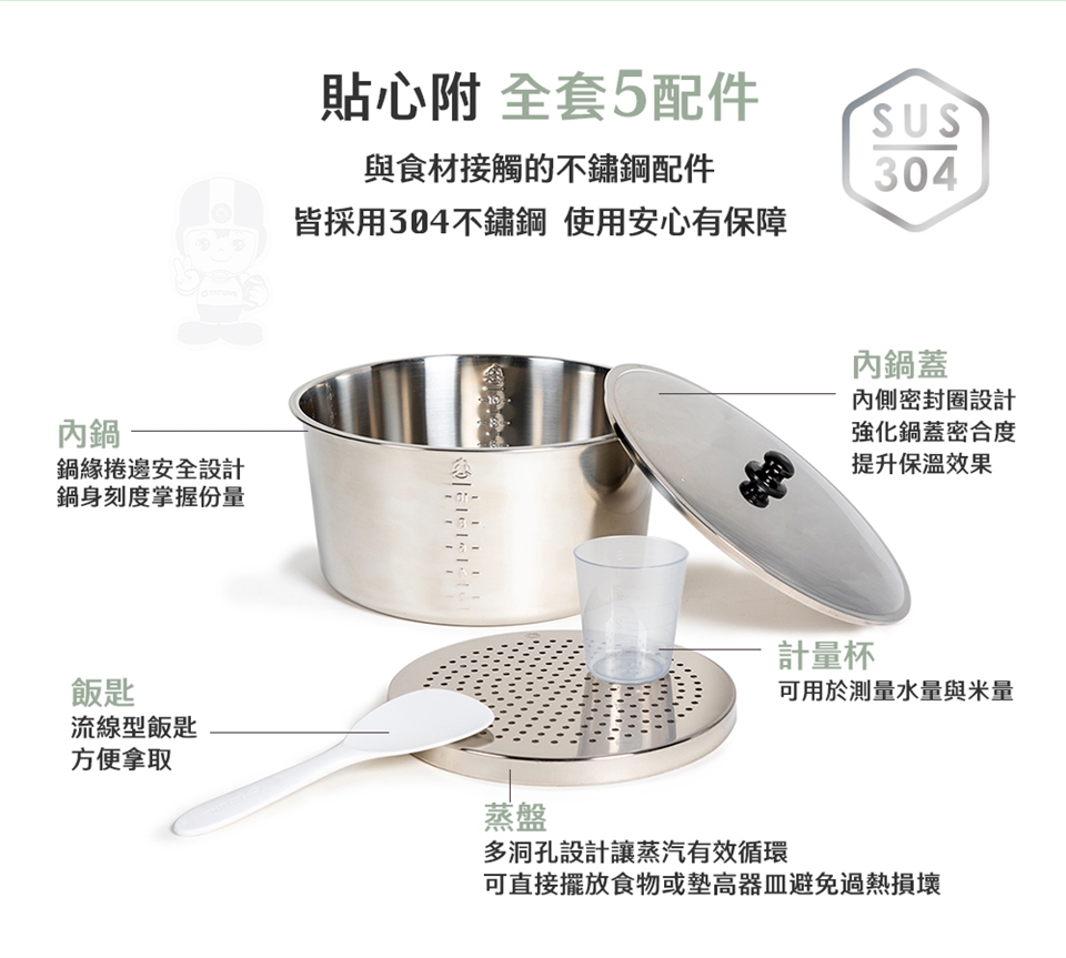 內含:飯匙、內鍋、內鍋蓋、量米杯、蒸盤等配件齊全,一機到位。