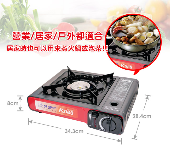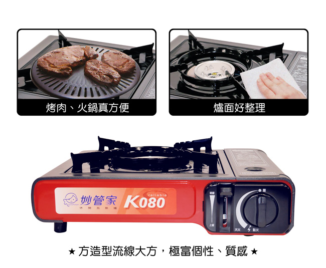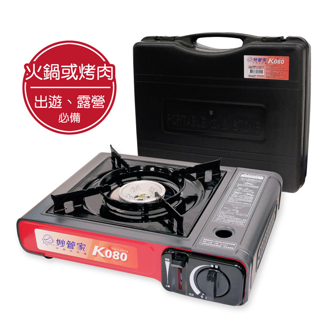 妙管家K080 休閒瓦斯爐是一款附有手提箱的攜帶型瓦斯爐,適用於戶外旅遊、露營烤肉或居家煮食。 其特點包括:攜帶方便、不佔空間、造型流線、附手提箱易於收藏,並通過CNS 檢驗合格。 產品材質為鋼板、鋁合金,耗氣量約為160g/hr,重量約為1.4kg