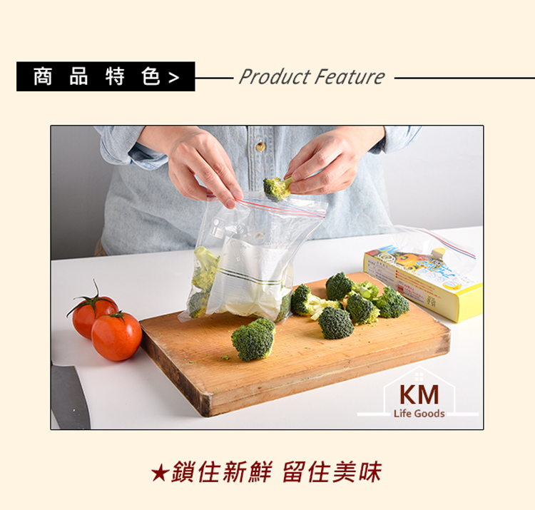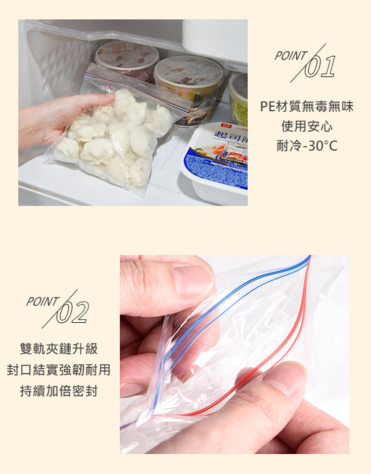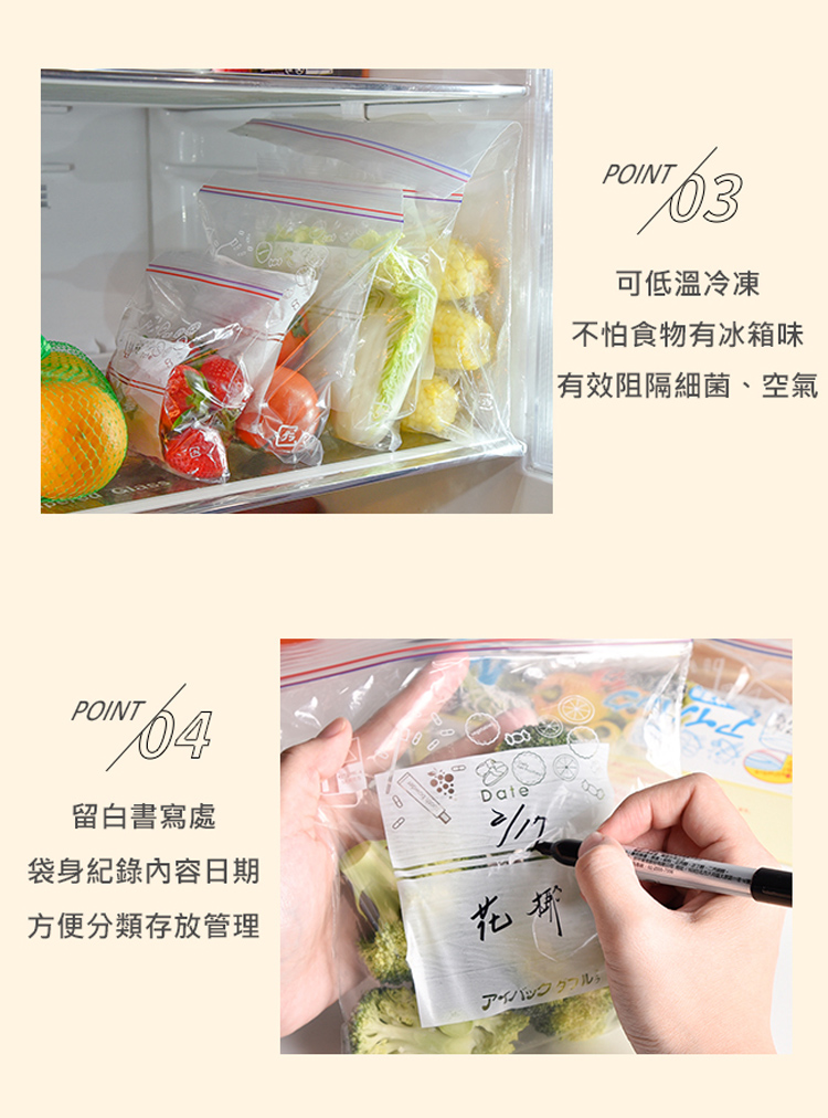 日本【雙夾鏈|加厚密封】密封夾鏈保鮮袋食物保鮮袋密封袋密封保鮮袋夾鏈袋保鮮袋分裝袋食物夾鏈袋密封收納袋密封保鮮袋密封食物袋PE夾鏈袋包裝袋家用塑封袋蔬果分裝/冰箱收納/冷凍分裝專用LMS三尺寸各一食材存放於冰箱內。