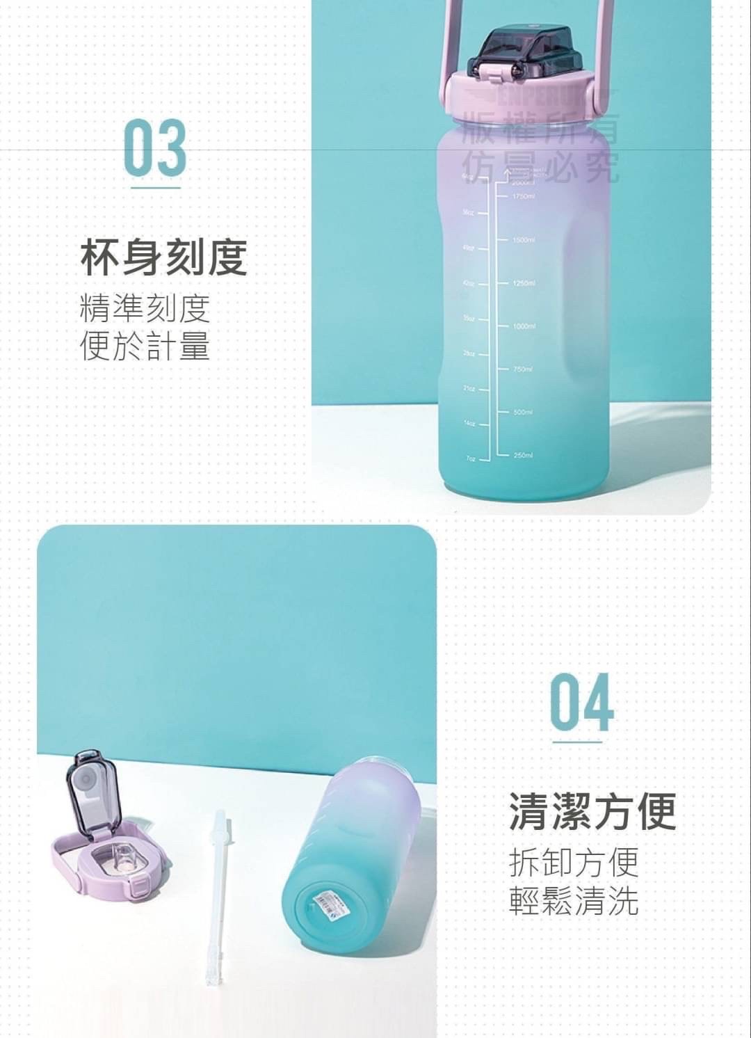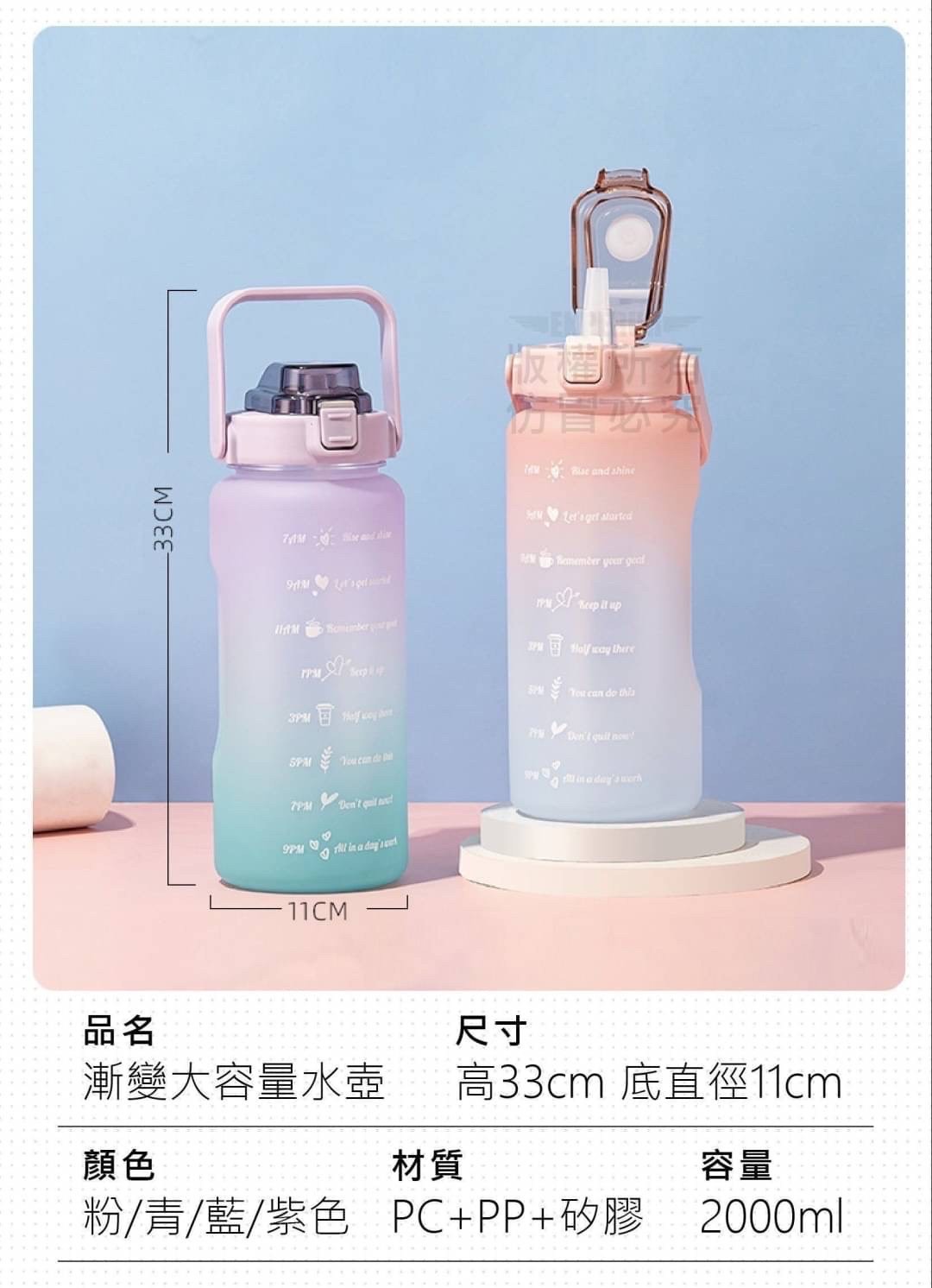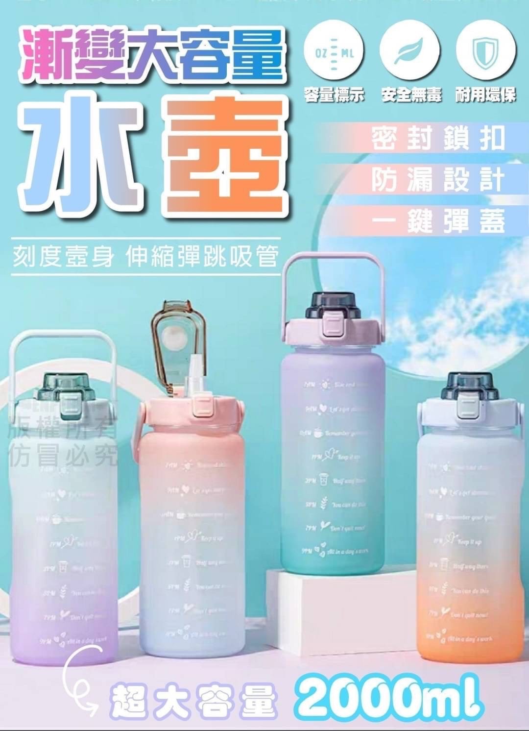 漸變大容量水壺是一種具有大容量、漸變色彩設計、並結合實用功能的運動水壺。 其特點包括:漸變色彩提供絢麗的外觀,大容量滿足運動或日常飲水需求,通常採用Tritan材質等食品級材料,不含雙酚A,安全耐用。 此外,它還具備防漏設計、方便攜帶的提把,以及易於使用的按壓式開蓋和舒適手感的磨砂杯身。