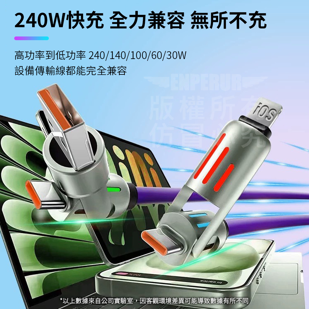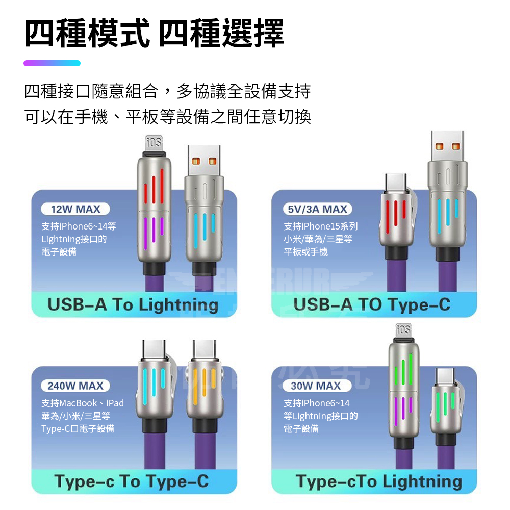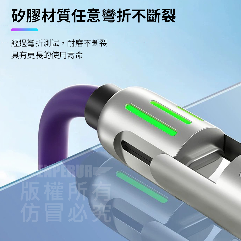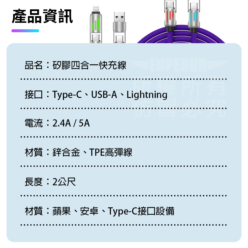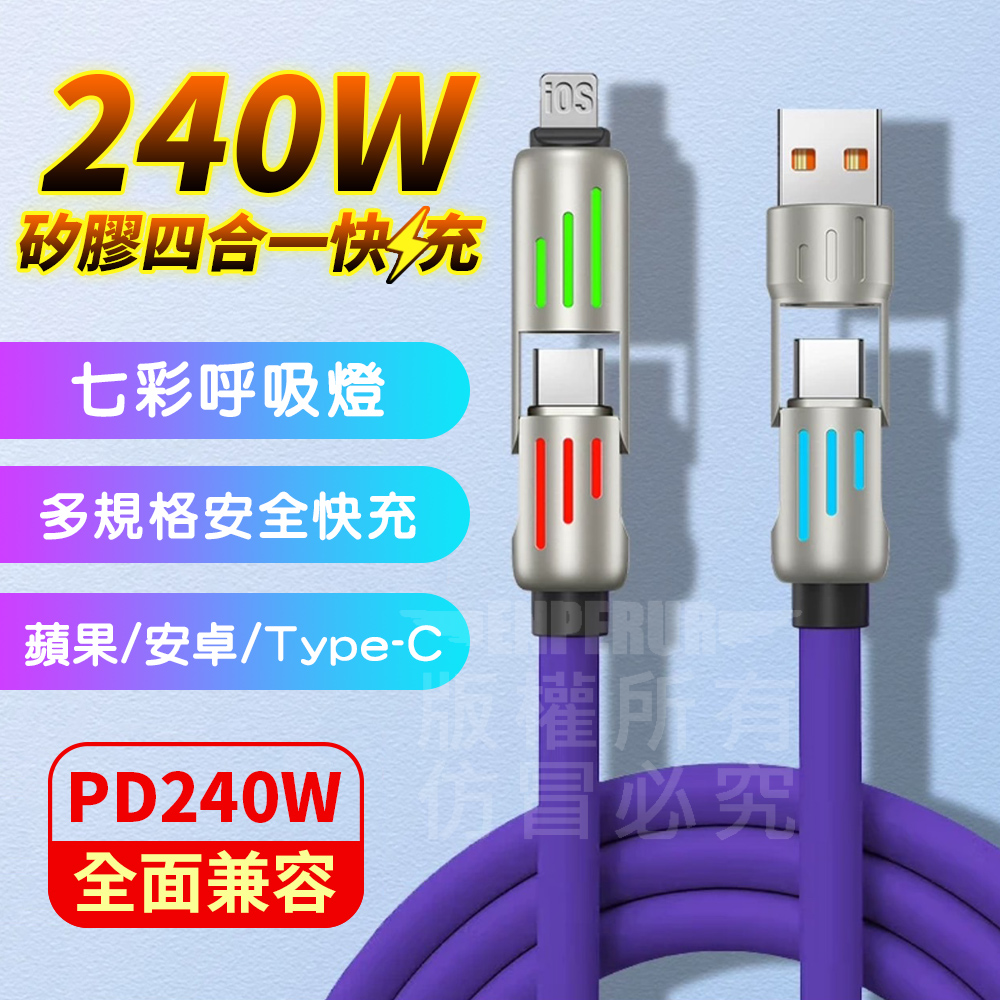 矽膠四合一快充線是一款集多種充電接口於一身的充電線,通常採用矽膠或編織線身,結合USB-AUSB-CLightning蘋果)和Micro-USB等常見接口,支援PDUSB Power Delivery)和QCQuick Charge)快充技術,可同時為Android、iPhone和具有Type-C接口的設備充電,甚至可為部分筆記型電腦充電,同時也兼具數據傳輸功能。