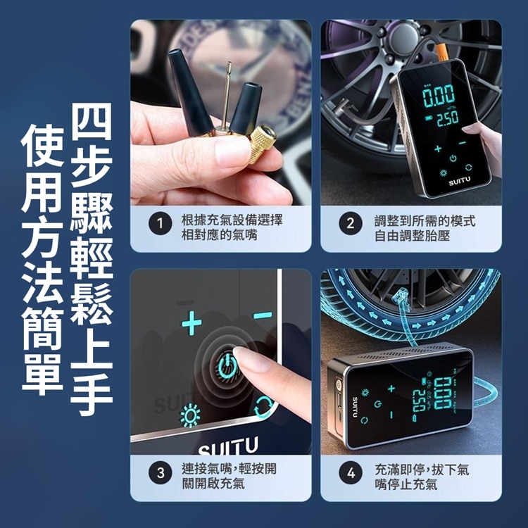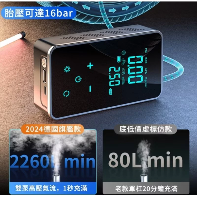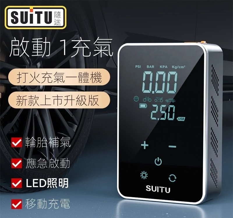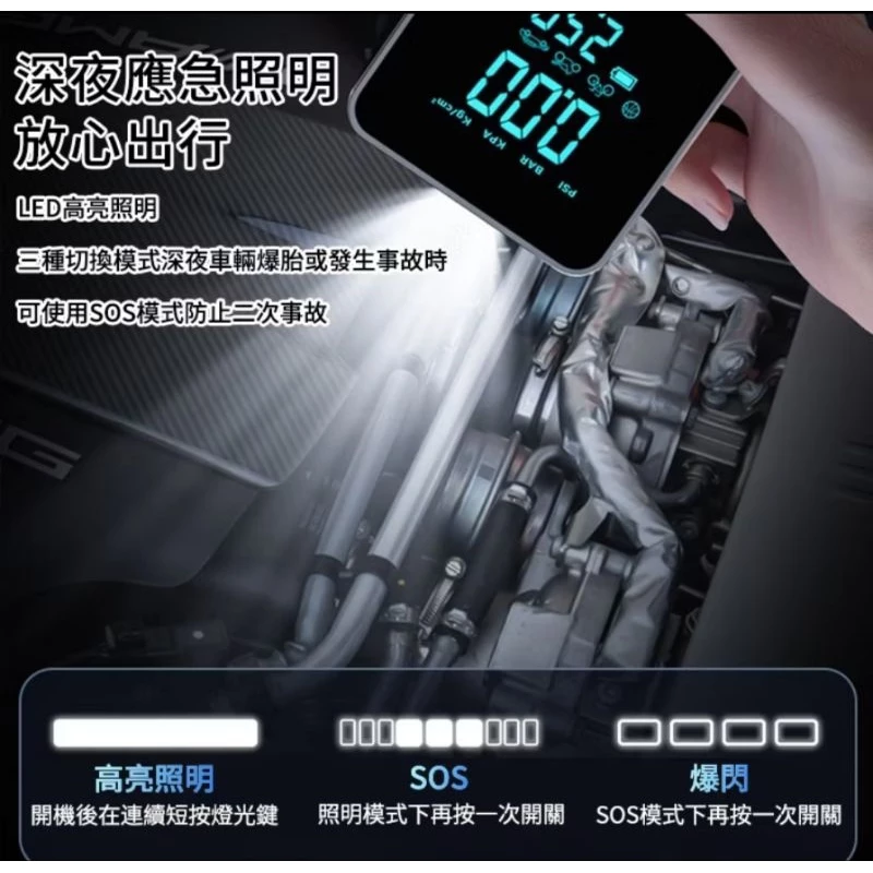 一機多用:集成打氣機、啟動電源、LED燈、行動電源。