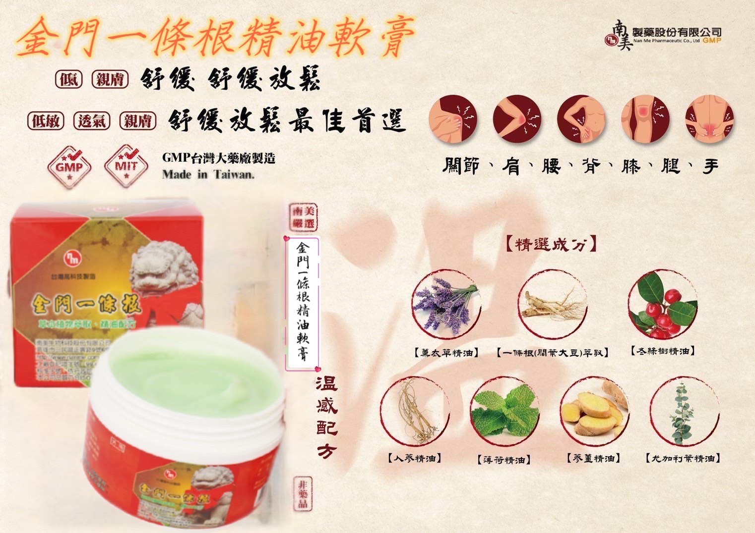 金門一條根軟膏(30g)是一款外用草本軟膏,主要成分為一條根萃取液、薄荷、尤加利、檀香等精油,質地清涼舒適,用於舒緩肌膚不適感與壓力,並有助於穴道及筋絡緩解。 使用時取適量塗抹於患處,一日數次,並應置於陰涼處,避免兒童接觸。