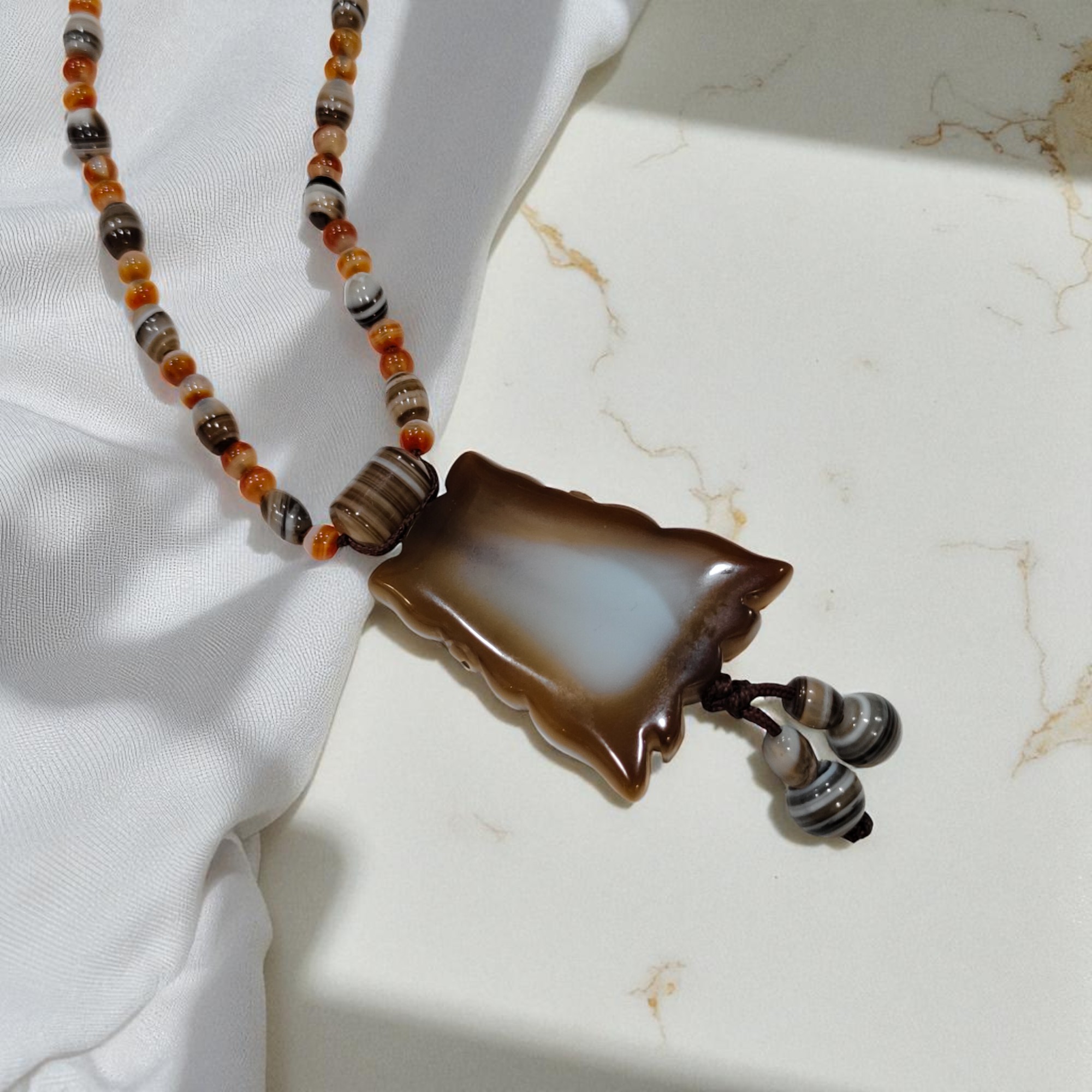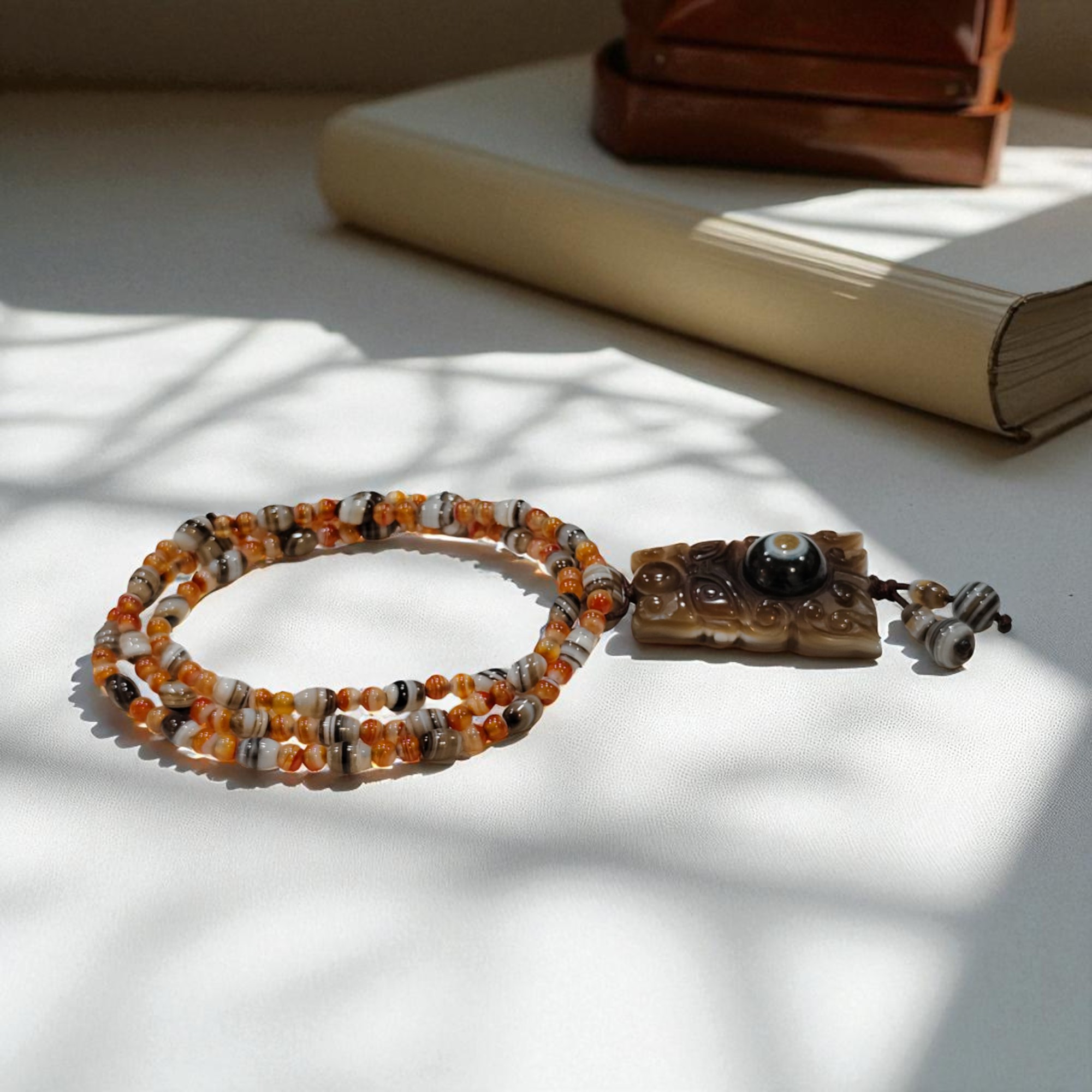 天珠主要由九眼石頁岩製成,也含有玉髓和瑪瑙的成分,是一種獨特的礦物組合,天珠上獨特的眼狀紋飾是天然形成的,是由於瑪瑙中不同環帶的成分和結構差異,以及岩漿凝固、冷卻過程中形成的各種自然圖案,包括線條、圓形、方形、三角形、多邊形及抽象圖案等