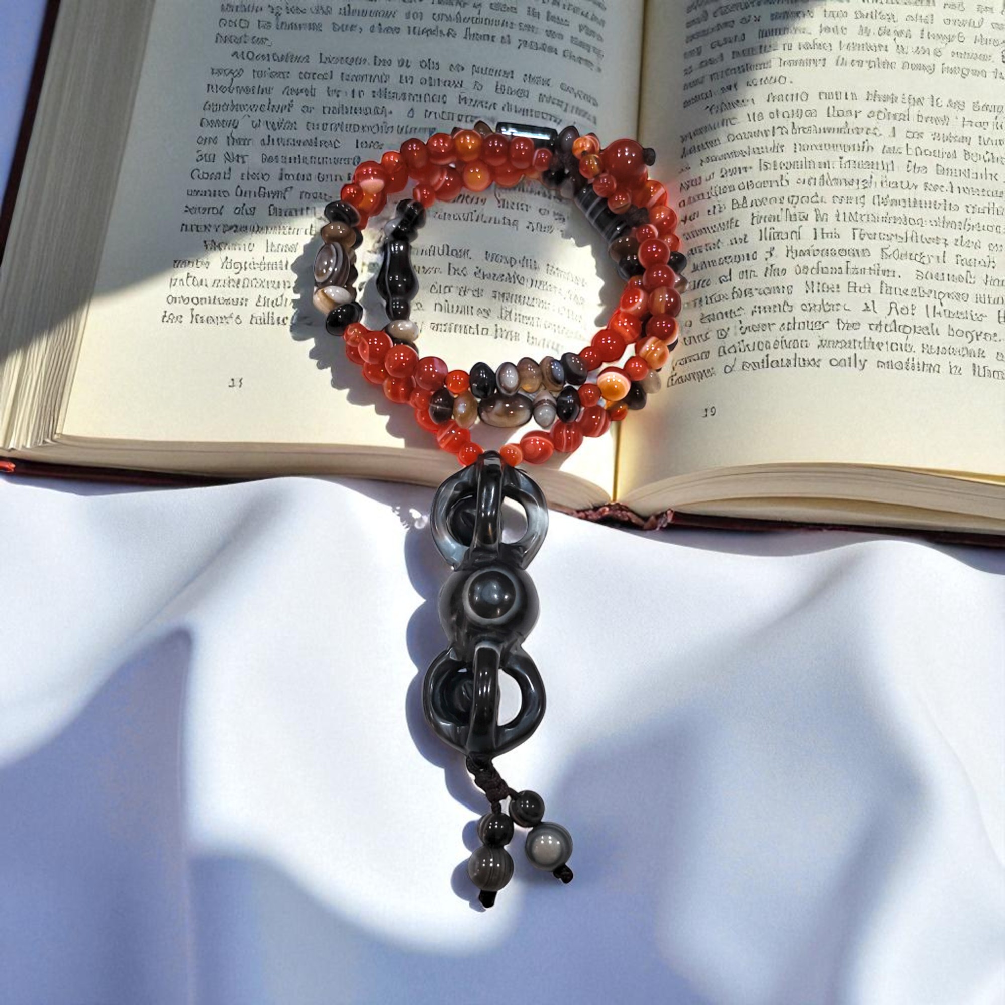 天珠主要由九眼石頁岩製成,也含有玉髓和瑪瑙的成分,是一種獨特的礦物組合,天珠上獨特的眼狀紋飾是天然形成的,是由於瑪瑙中不同環帶的成分和結構差異,以及岩漿凝固、冷卻過程中形成的各種自然圖案,包括線條、圓形、方形、三角形、多邊形及抽象圖案等