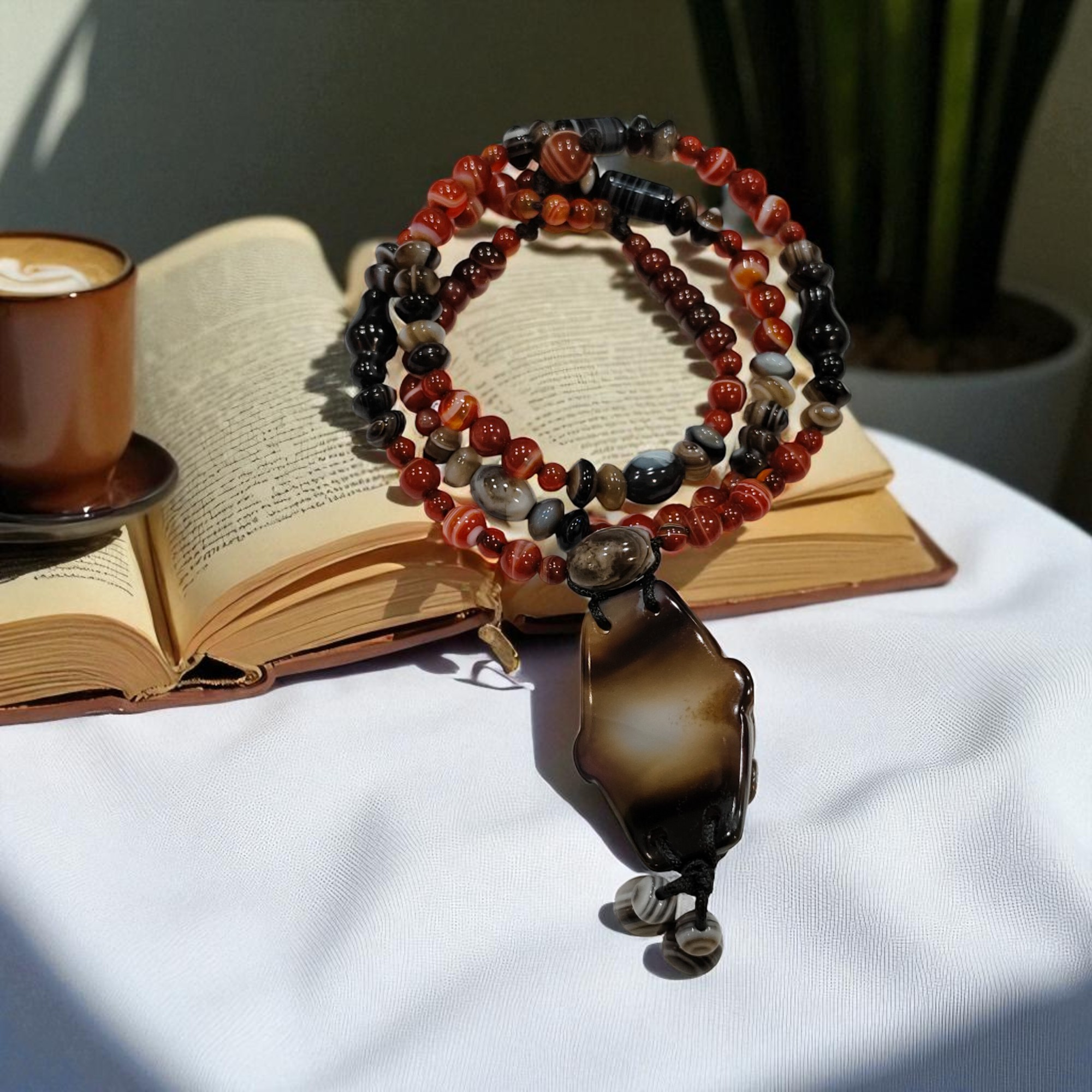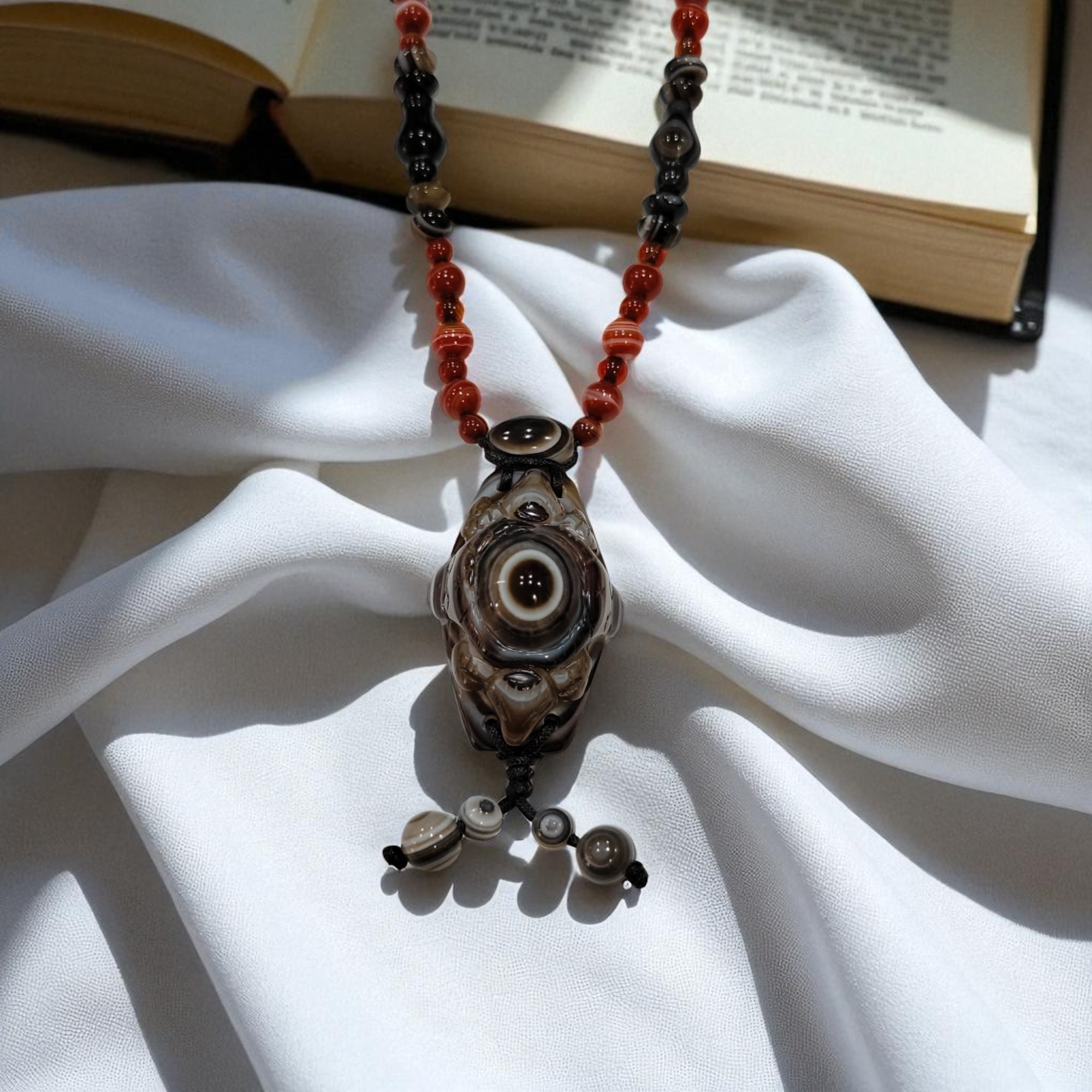 天珠主要由九眼石頁岩製成,也含有玉髓和瑪瑙的成分,是一種獨特的礦物組合,天珠上獨特的眼狀紋飾是天然形成的,是由於瑪瑙中不同環帶的成分和結構差異,以及岩漿凝固、冷卻過程中形成的各種自然圖案,包括線條、圓形、方形、三角形、多邊形及抽象圖案等