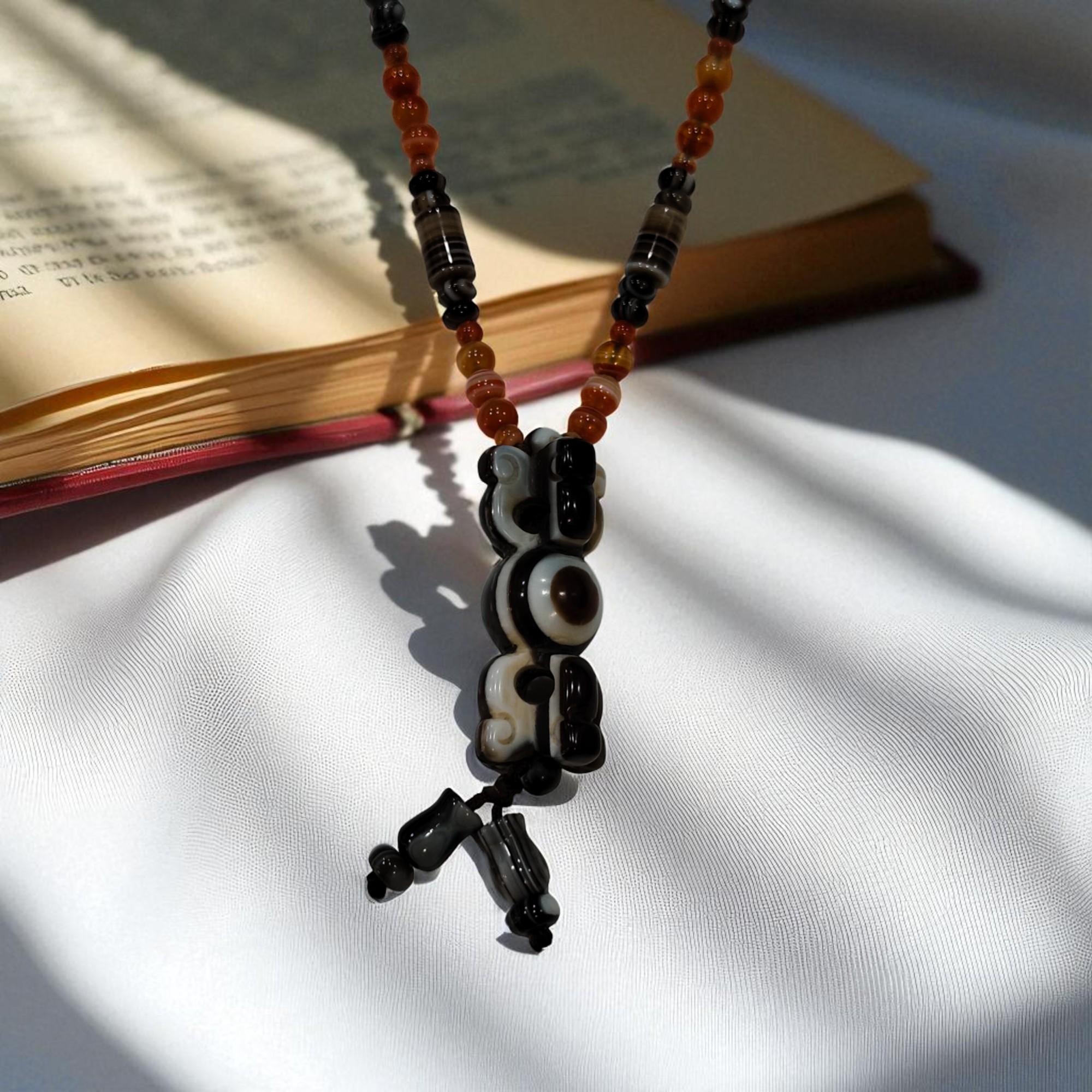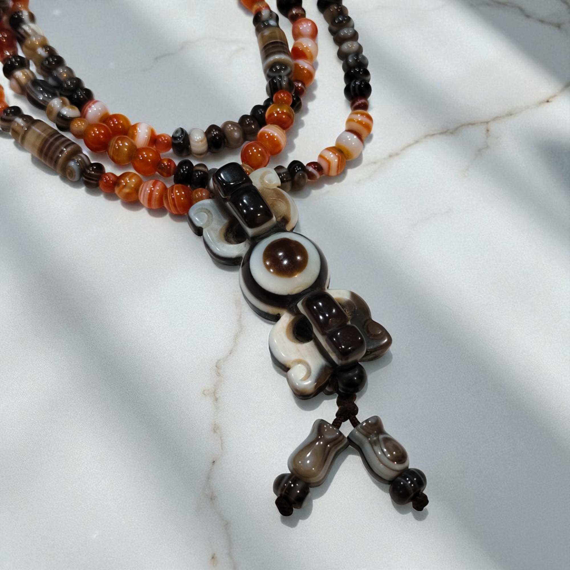 天珠主要由九眼石頁岩製成,也含有玉髓和瑪瑙的成分,是一種獨特的礦物組合,天珠上獨特的眼狀紋飾是天然形成的,是由於瑪瑙中不同環帶的成分和結構差異,以及岩漿凝固、冷卻過程中形成的各種自然圖案,包括線條、圓形、方形、三角形、多邊形及抽象圖案等