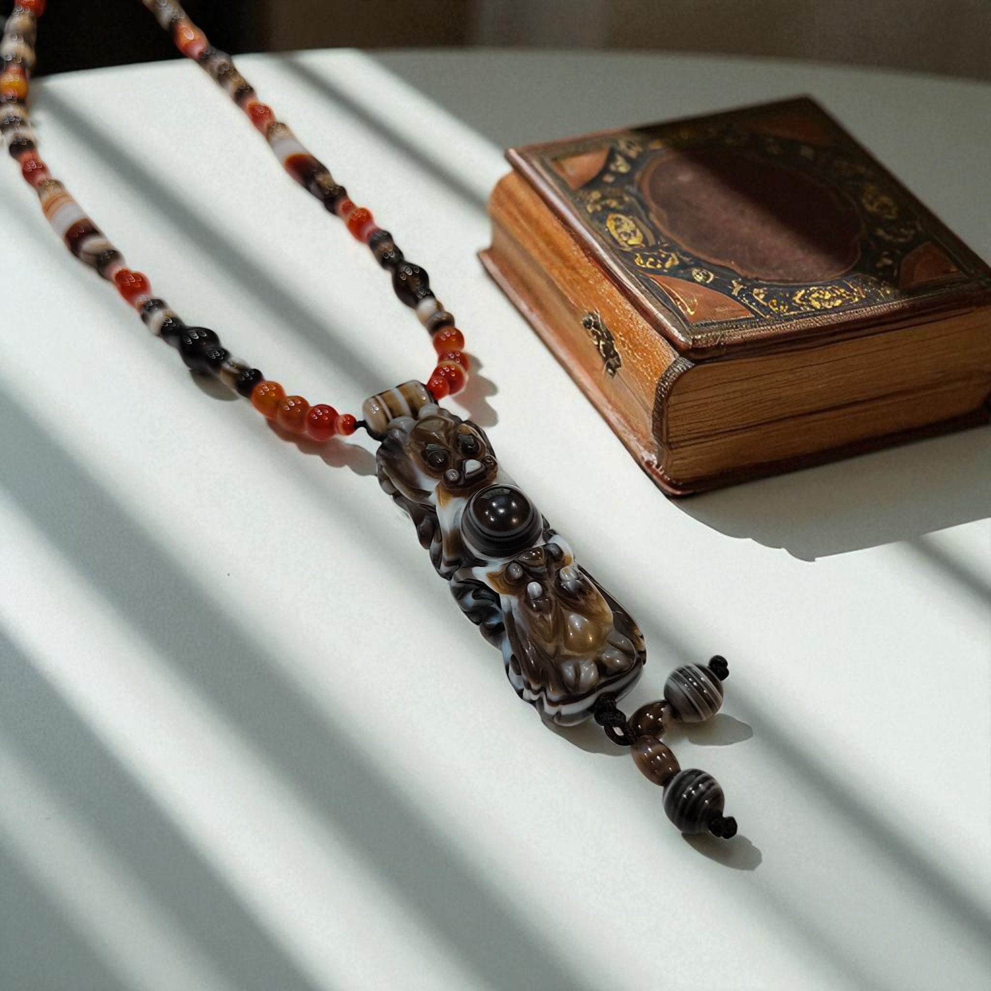 天珠主要由九眼石頁岩製成,也含有玉髓和瑪瑙的成分,是一種獨特的礦物組合,天珠上獨特的眼狀紋飾是天然形成的,是由於瑪瑙中不同環帶的成分和結構差異,以及岩漿凝固、冷卻過程中形成的各種自然圖案,包括線條、圓形、方形、三角形、多邊形及抽象圖案等