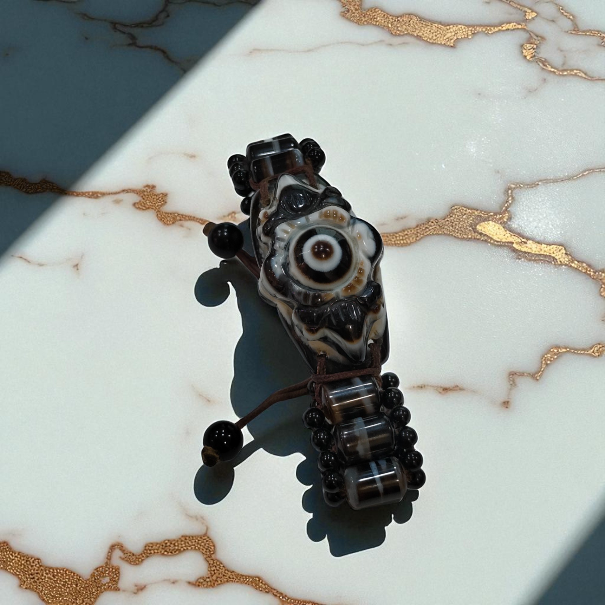 天珠主要由九眼石頁岩製成,也含有玉髓和瑪瑙的成分,是一種獨特的礦物組合,天珠上獨特的眼狀紋飾是天然形成的,是由於瑪瑙中不同環帶的成分和結構差異,以及岩漿凝固、冷卻過程中形成的各種自然圖案,包括線條、圓形、方形、三角形、多邊形及抽象圖案等
